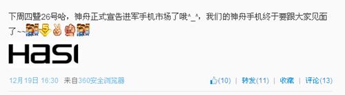 在首款手機曝光之後,神舟電腦近日通過官方微博正式宣布進軍手機市場。此外,神舟還宣布,旗下首款手機將於下周四(12月26日)正式與大家見面。
