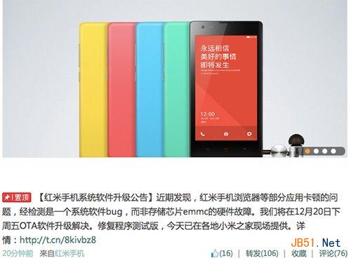 小米科技稱,該卡頓經檢測是由於軟件Bug造成,而非瘋傳的emmc硬件故障。紅米手機的emmc供應商由美光、三星、現代、閃迪四家構成。由於軟件Bug,美光的emmc會被軟件識別為unknown設備,但不影響使用。造成卡頓的原因在於系統Bug,而非emmc故障。
