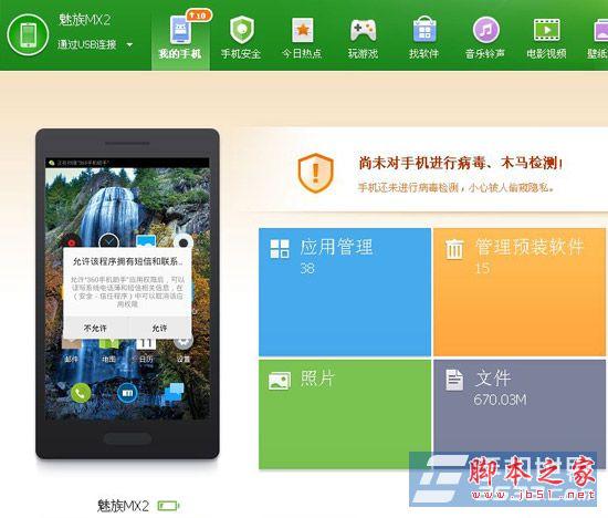 2)在電腦上安裝安卓管理軟件,現在小編示范的360手機助手,將手機用數據線與電腦的USB接口相連接,並運行360手機助手軟件,軟件會自動聯網並下載手機所需要的驅動程序,驅動下載完成後會自動進入安裝過程,此時會彈出Windows安全的對話框,勾選“始終信任來自……的軟件”,並點擊安裝。驅動安裝完畢後,軟件會自動初始化相關設置並會提示在手機端安裝手機版的360手機助手,安裝完成後魅族MX2就已電腦連接上,可以在電腦上管理你的手機了!