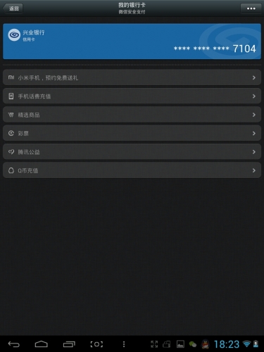 第八步,設置完微信支付密碼後,點擊完成後,出現如下圖的我的銀行卡頁面,我的銀行卡頁面多出了綁定銀行卡的信息,和“小米手機,預約免費送禮”及相關微信支付推出的彩票、話費充值、Q幣充值等內容,第如下圖,首先我們點擊第一個選項“小米手機,預約免費送禮”: