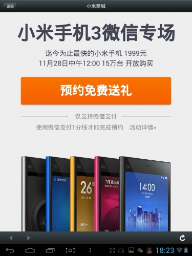 11月26日12:00小米官方搶購正常進行!該活動將於11月28日12:00開放搶購小米3,且在預約的時候需要先進行支付1分錢進行預約,以確認你的微信可以正常進行支付,便於11月28日搶購時進行正常的搶購並支付!
