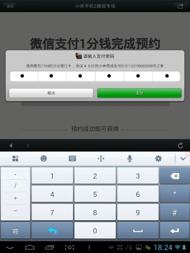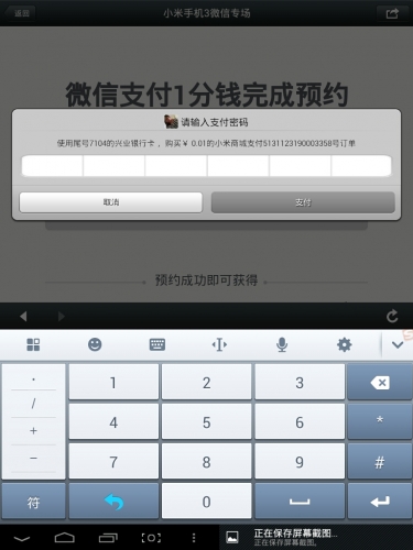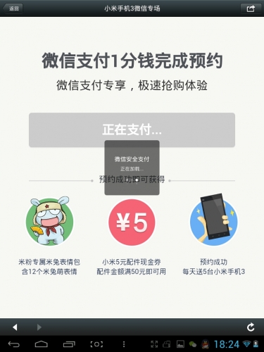 第十一步,點擊立即支付,支付1分錢進行小米3的預約,如下圖正在加載,並輸入剛才設置的微信支付密碼進行支付: