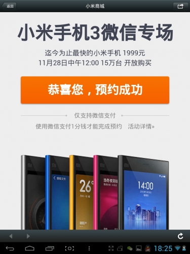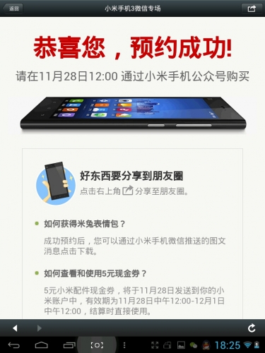 以上就完成了小米3 11月28日微信專場的預約,在這裡祝米粉們搶購成功,大家如果覺得好的話麻煩分享一下哦!謝謝!