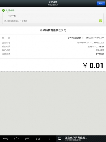 2.預約搶購時支付的1分錢支付給小米公司了,如下圖: