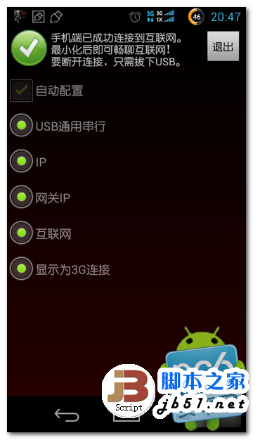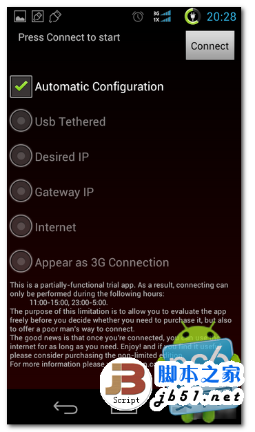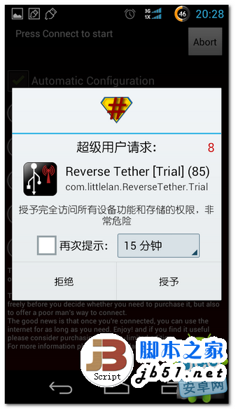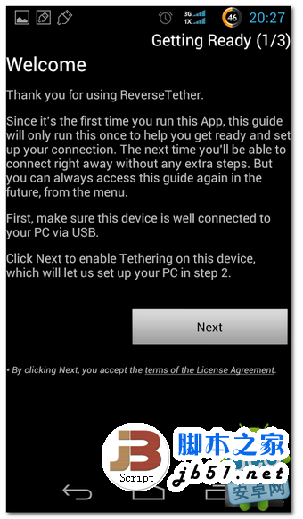 下面我們打開剛安裝的Reverse Tether,這是google play裡的最新版漢化版。設置很簡單,直接下一步就可以了,到最後連接時會提示需要ROOT授權,授權後,點擊reverse tether 軟件的右上角的connect就可借用電腦網絡了。