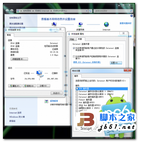 安裝完成後我們把手機用USB連接電腦,設置成USB共享網絡的模式。如果之前沒有使用過這個功能可能需要安裝相關驅動。連接成功能電腦會增加一個本地連接,(如果沒有,是因為驅動沒裝好)。為與原來的區別,我們暫且取名為 android。打開原有的那個本地連接——屬性——上面右邊的共享——勾選第一個框“允許其他網絡用戶通過此計算機的internet連接,選擇新的這個android連接——再點下面的設置,勾選HTTP等。OK,設置完畢!以後用的話就不用設置了。