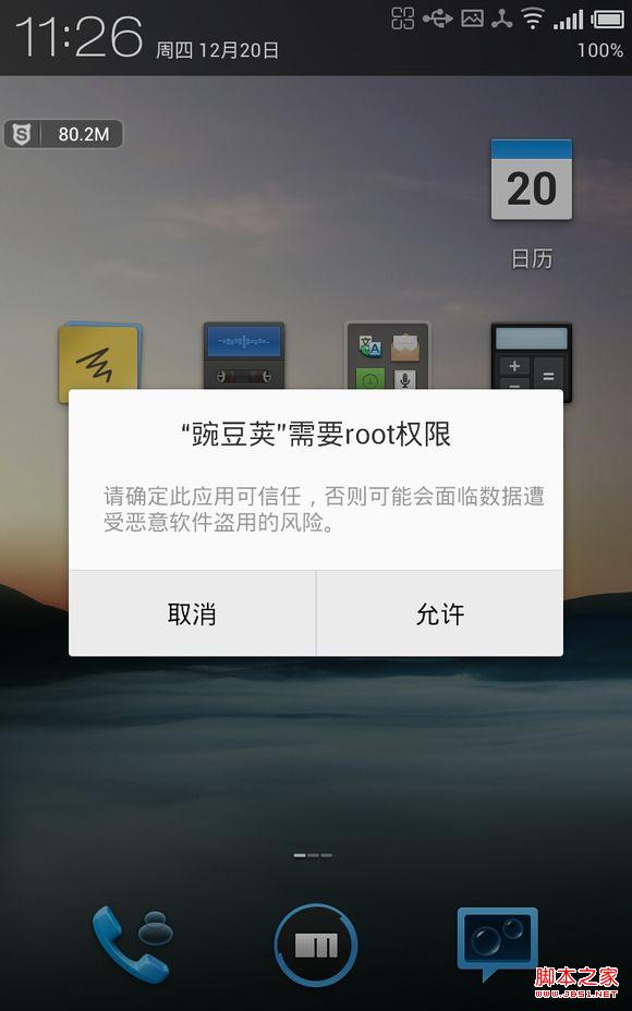 ↑用電腦打開豌豆夾確認連接上手機 然後依上圖序號 1.先打開應用和游戲 2.點擊系統 把你認為不需要的ROOT掉(我的建議 play商店 google talk 新聞和天氣 [應用中心 便簽用的上就要 反之root] 如果不想變磚別的程序不要動) 3.卸載 手機屏幕出現需要ROOT權限如下圖↓ 點允許(一般出現3次) 卸載成功