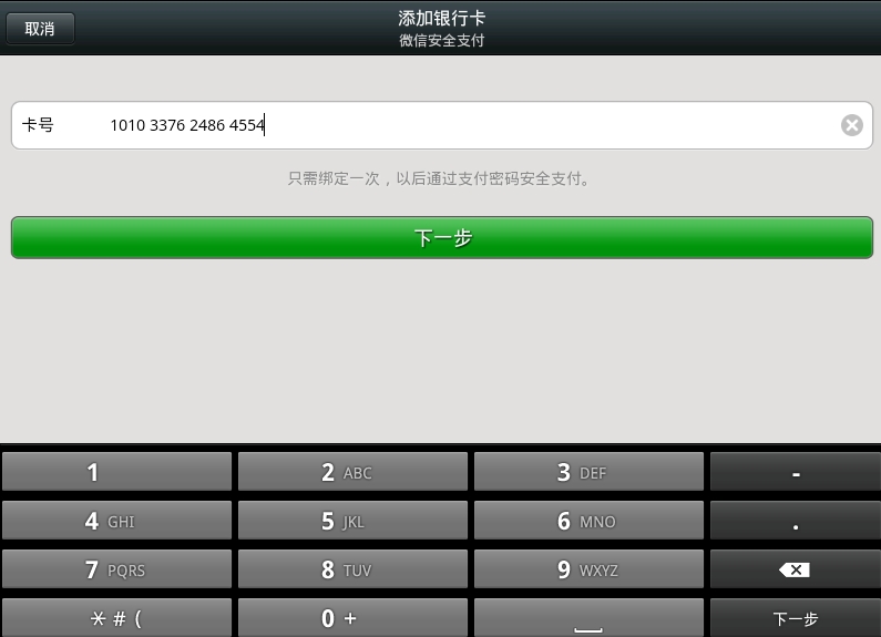 3.輸入你要綁定的銀行卡賬號,然後點擊下一步即可完成綁定。
