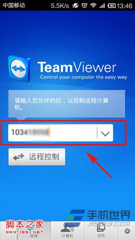 3)點擊手機端“TeamViewer”打開,在主界面上輸入電腦端主界面上的“你的ID”數字後點擊“遠程控制”。“TeamViewer”將會跳轉到連接界面。(如下圖所示)