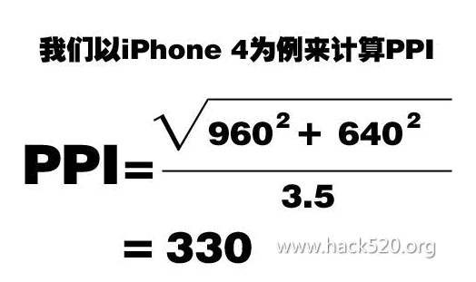 iPhone 4 PPI為330是如何計算出來的呢?我也不知道,就去網上尋找答案,好像還真不好找,不過還是找到了。PPI是英文Pixels per inch的縮寫,意思就是每英寸所擁有的像素(Pixel)數目,搞清楚了PPI是什麼意思,我們就能很容易理解PPI的計算方式了,我們需要首先算出手機屏幕的對角線等效像素,然後除以對角線(我們平常所說的手機屏幕尺寸就是說的手機屏幕對角線的長度),就可以得到PPI了。准確的計算公式大家可以參照下圖: