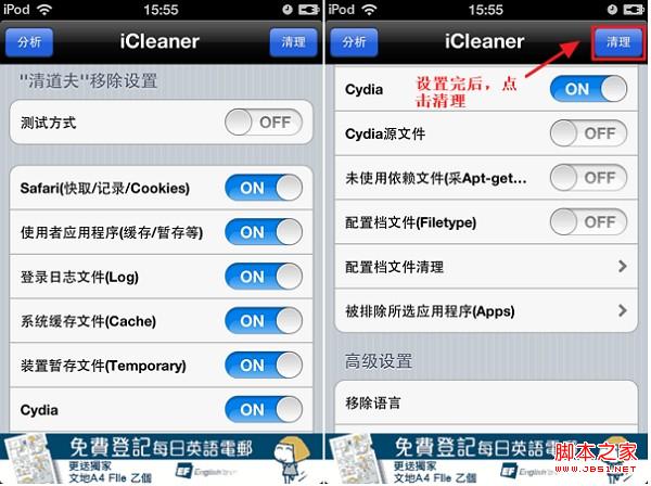 2)然後可自由設置要清理的無用文件和信息,點擊清理,耐心等待完成(警告:發現不少用戶在使用iCleaner—語言移除功能時,不小心把中文刪除了沒法恢復,只能重刷機,慎用語言移除功能)。