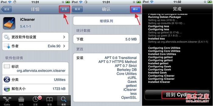 然後進去iCleaner的詳細頁,點擊安裝—確認—耐心等待安裝完成,返回cydia即可。