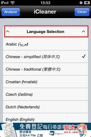 1)運行iCleaner,可以先把語言切換至中文。下拉至language selection(選擇語言),選擇中文,退出程序後,雙擊home鍵可看到後台運行的程序,將icleaner完全關閉後重開就能看到中文版的iCleaner。