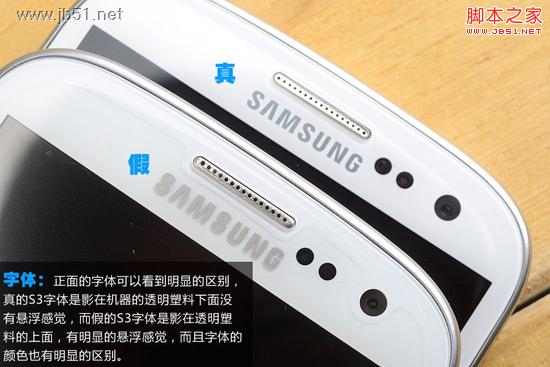 字體:正面的字體可以看到明顯的區別,真的S3字體是影在機器的透明塑料下面沒有懸浮感覺,而假的S3字體是影在透明塑料的上面,有明顯的懸浮感覺,而且字體的顏色也有明顯的區別。