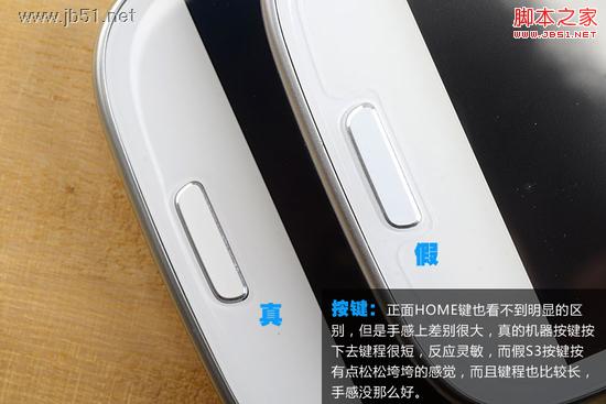 按鍵:正面HOME鍵也看不到明顯的區別,但是手感上差別很大,真的機器按鍵按下去鍵程很短,反應靈敏,而假S3按鍵按有點松松垮垮的感覺,而且鍵程也比較長,手感沒那麼好。
