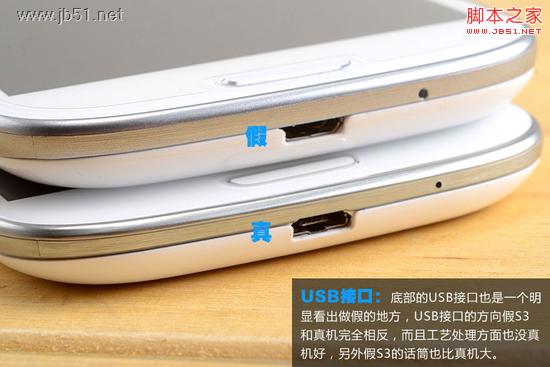 USB接口:底部的USB接口也是一個明顯看出做假的地方,USB接口的方向假S3和真機完全相反,而且工藝處理方面也沒真機好,另外假S3的話筒也比真機大。