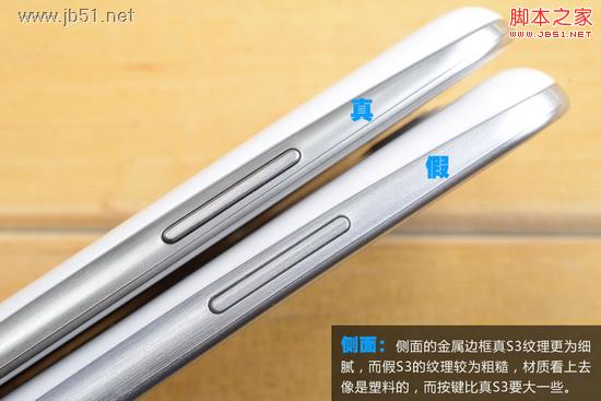 側面:側面的金屬邊框真S3紋理更為細膩,而假S3的紋理較為粗糙,材質看上去像是塑料的,而按鍵比真S3要大一些。