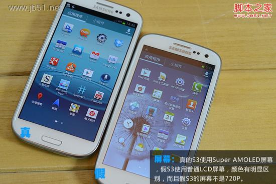 屏幕:真的S3使用Super AMOLED屏幕,假S3使用普通LCD屏幕,顏色有明顯區別,而且假S3的屏幕不是720P。
