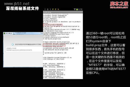 通過360一鍵root可以輕松將假S3進行root機,root機之後打開system目錄下build.prop文件,這裡可以看到很多東西,首先手機的型號可以在這個文件進行修改,但是一些關鍵的東西是不能改的,在這個文件裡面可以發現“MT6577”的字段,可以確定假S3是使用MTK的MT6577雙核CPU。