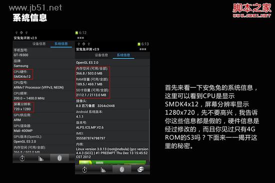 首先來看一下安兔兔的系統信息,這裡可以看到CPU是顯示SMDK4x12,屏幕分辨率顯示1280x720,先不要高興,我告訴你這些信息都是假的,硬件信息是經過修改的,而且你見過只有4G ROM的S3嗎?下面來一一揭開這裡的秘密。