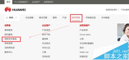 2/在華為官網裡點擊“技術支持”,然後點擊“保修狀態查詢”