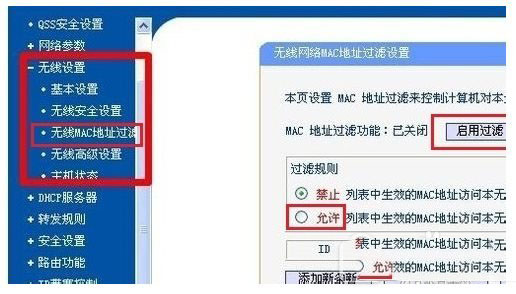 在“無線設置”的無線MAC地址過濾,啟用過濾,允許保存設置!