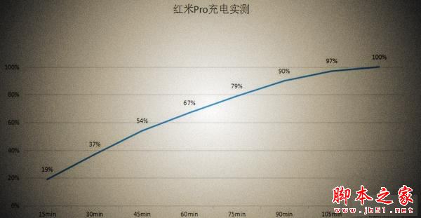實際充電測試中,紅米Pro由0%充至100%,總共耗時115分鐘。前期充電速度較快,至90%以後速度則有著明顯的下降。不得不說,紅米Pro的整體充電時間有些過長。
