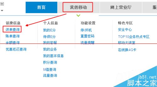 2、成功登錄網站後點擊“我的移動”選擇“詳單查詢”