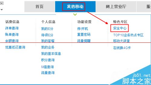 2、同樣我們先點擊“我的移動”接著選擇“安全中心”