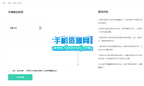 2:然後到這個網站上點擊進入,申請解鎖,然後要填寫 姓名、手機號、申請理由 並勾選《小米手機解鎖協議》,填寫手機接收到的驗證碼