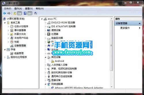 2:將手機開啟USB調試,連接至電腦,同時右鍵“計算機”(XP為“我的電腦”)--“管理”--設備管理器