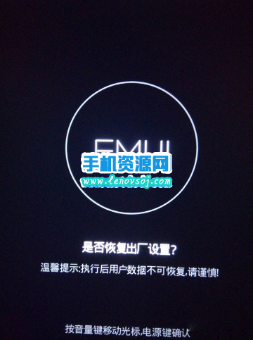 1:恢復出廠設置。在recovery界面按音量下鍵選取恢復出廠設置,按開機鍵確定。提示如下圖:此時會再次提醒你是否恢復出廠設置,恢復完畢,會自動跳轉至REC主頁面。