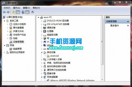 2:將手機開啟USB調試,連接至電腦,同時右鍵“計算機”(XP為“我的電腦”)--“管理”--設備管理器