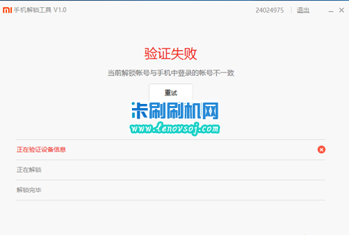 7:注意:刷入開發版後,一定聯網登錄已審核通過解鎖的小米賬號,否則無法正常解鎖!會出現如下錯誤