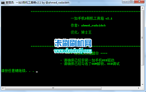 2:然後把之前下載下來的recovery工具包在電腦上進行解壓,解壓出來一個文件夾,然後在文件夾裡找到【刷機工具箱v2.1中文版.bat】文件直接雙擊打開運行,然後按回車鍵,接著輸入字母7並按回車鍵,輸入字母Y即可開始進入刷recovery的操作了。