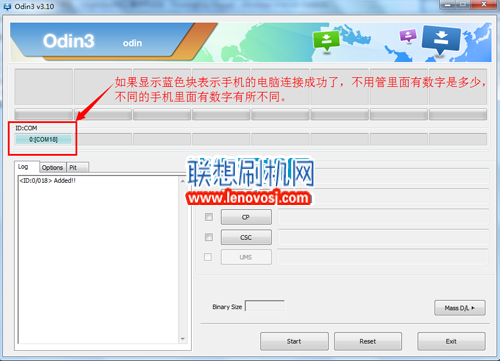 4:打開odin軟件之後軟件會自動識別你的手機,識別成功後會在ID:COM處顯示藍色的(表示手機連接成功了,如果沒有顯示藍色的,說明沒有有連接好),然後勾選AP,選取之前下載並解壓出來的tar格式的recovery文件包。
