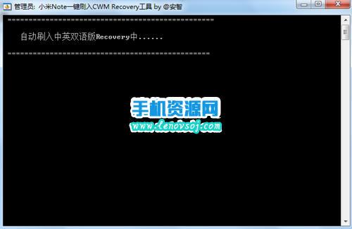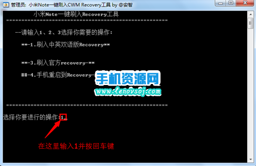 2:然後把之前下載下來的recovery工具包在電腦上進行解壓,解壓出來一個文件夾,然後在解壓出來的文件夾裡找到【小米Note_CWM Recovery 6.0.5.1.exe】文件直接雙擊打開運行,然後輸入1並按回車鍵之後,就會自動開始刷入recovery了。