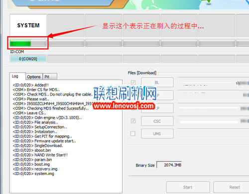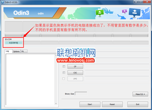 4:打開odin軟件之後軟件會自動識別你的手機,識別成功後會在ID:COM處顯示藍色的(表示手機連接成功了,如果沒有顯示藍色的,說明沒有有連接好),然後分別點擊相應的按鈕選擇相應的rom文件。