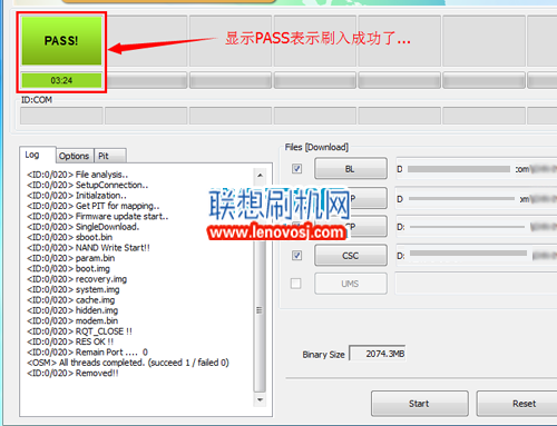 6:刷完之後,上面會顯示【PASS】字樣就表示刷入成功了。