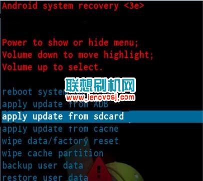 1,把手機先關機,然後按住電源鍵和音量減鍵不放,會進入recovery英文模式;一次不能進入,多試幾次就進去了:如下圖所示: