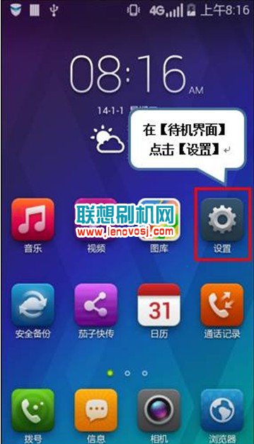 1、 在”待機界面“找到“設置”選項並點擊它,如下圖所示: