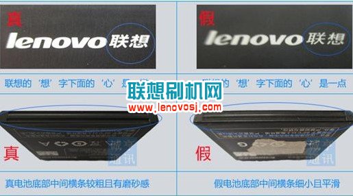 1、首先聯想手機原裝電池的上聯想LOGO中,有聯想兩個中文字,其中原裝的'聯想"兩字的想字下面的心字上面的一點為撇,而高仿的卻為一點。原裝電池底部中間橫條較粗用磨砂感,而假電池中間橫條較小且平滑。如下圖: