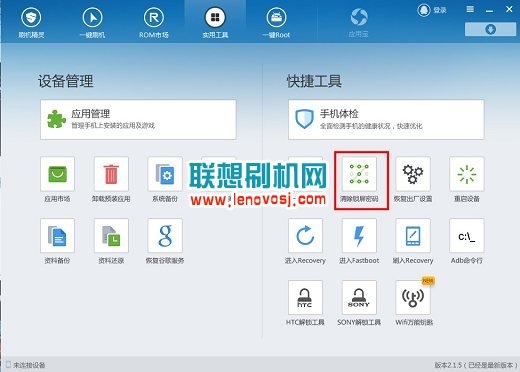 2,開啟了USB調試的聯想A305E就好辦了,你先連接上電腦,然後安裝好聯想刷機精靈>>>>>,然後運行,提示連接上刷機精靈後,進入上方的實用工具欄,其中有一個解圖案鎖的選項,點擊它,然後軟件就會為你自動解鎖了,手機重啟後,就好了。如下圖所示: