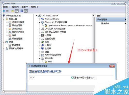 這時會拔出手機與電腦的USB連接,注意,電腦是要聯網的。然後重新插上。,這時候會自動安裝驅動,一會兒就安裝好了。