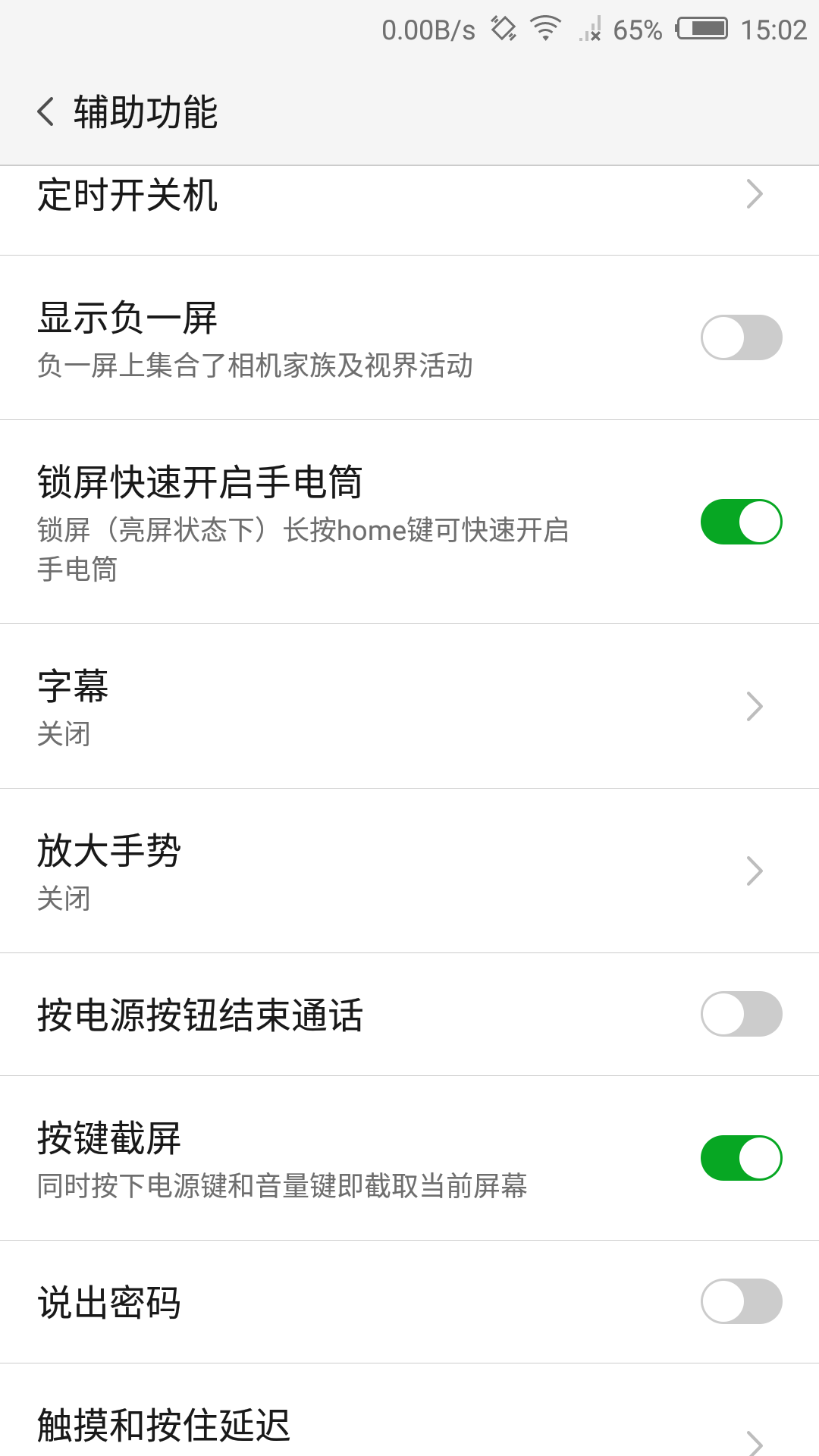 一,定時開關機,藏得有點深啊,好像生怕被人知道,哈哈。同一界面下還能設置負一屏的開關、鎖屏長按Home手電筒、按鍵截屏開關。當然還有觸摸和按住延時設置。