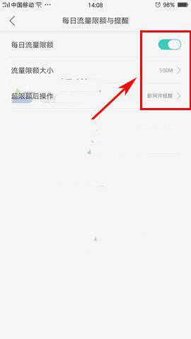 2:接著點擊【每日流量限額與提醒】,最後開啟開關,並且設置好【流量限額大小】以及【超限額後操作】就行了。(如下圖)