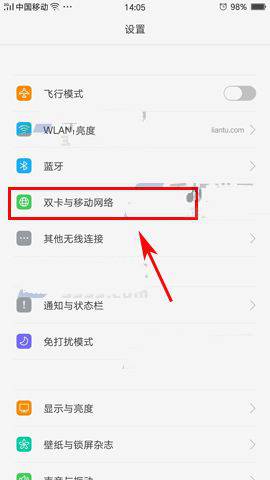 1:先打開手機的【設置】,進入設置菜單後再點擊【雙卡與移動網絡】選項。(如下圖)