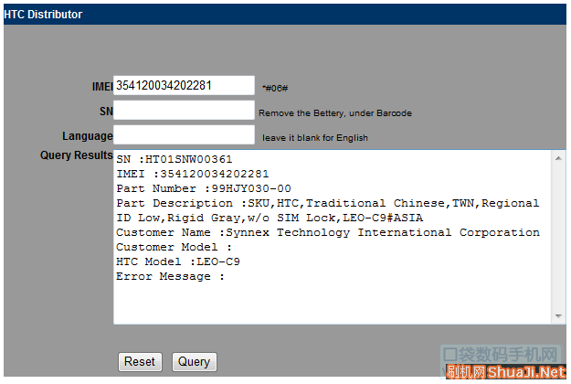 注意:IMEI 號只要前 15 位,最後兩位不要輸入。點按鈕“Query",即可得到機器的信息