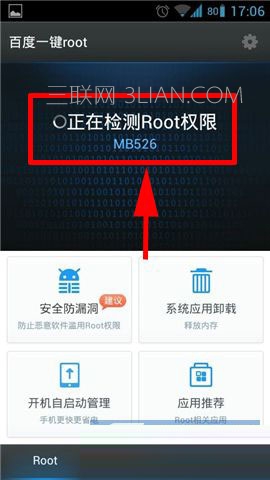 1)下載安裝並打開百度一鍵ROOT,進入應用後,它會自動識別機型並開始ROOT。(如下圖)
