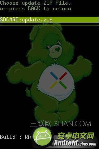 先關機,然後按住音量減鍵,再同時按開機鍵,即可進入recovery恢復模式。用音量鍵移動光標到第四項,按開關鍵確認選擇進入“Flash zip from sdcard”。